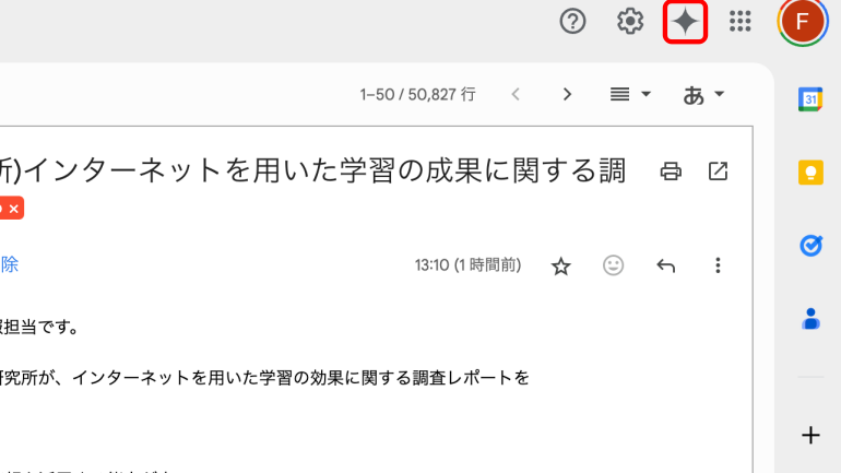 Google ChromeアプリでGmailを開くと、右上にGeminiアイコンが表示されていることがわかります。ここからメールの下書きを作るといった使い方が可能。