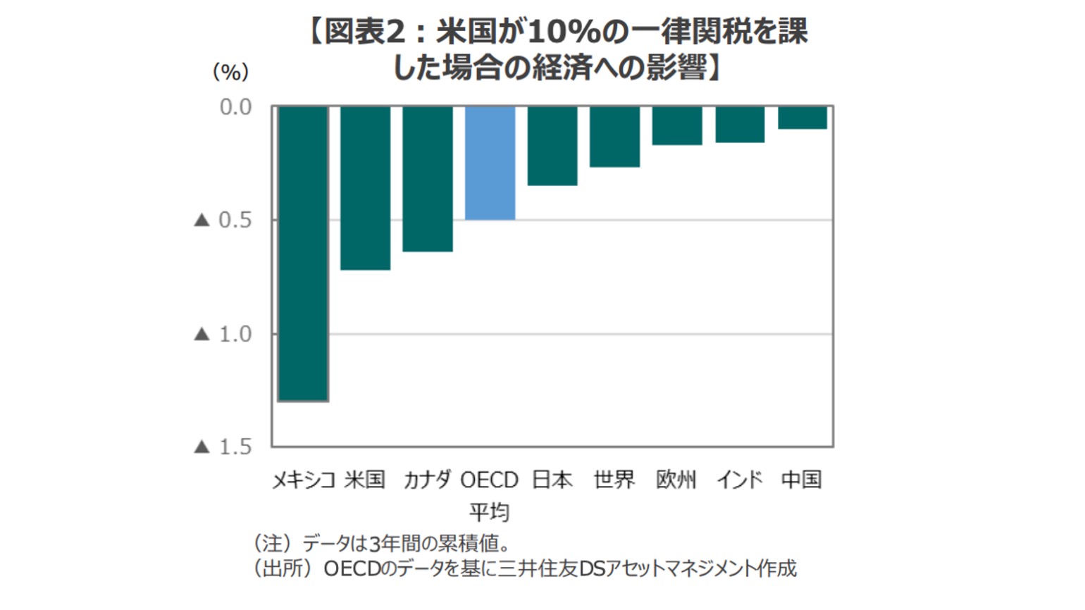 一方、三井住友DSアセットマネジメントの試算によれば、今回発表された一律関税と相互関税が額面通りに実行された場合、米国経済には約▲1.5~▲2%の下押し圧力が生じることになりそうだ。