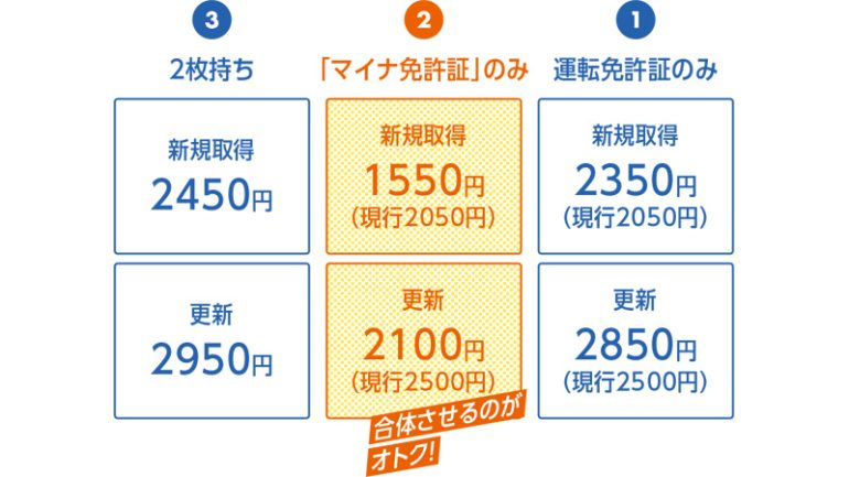 取得・更新のそれぞれに必要な交付手数料は、所持の仕方によって変わる。例えば「運転免許証のみ」と「『マイナ免許証』のみ」を比べてみると「『マイナ免許証』のみ」のほうが、新規取得で800円、更新で750円も安くなる。3通りの所持方法における手数料比較では「『マイナ免許証』のみ」を選択するほうが、一番オトクだ。また、計算上は「運転免許証のみ」の手数料に100円プラスするだけで〝2枚持ち〟ができる点も見逃せない。『マイナ免許証』の利便性を試してみたいという人は、〝2枚持ち〟もおすすめしたい。