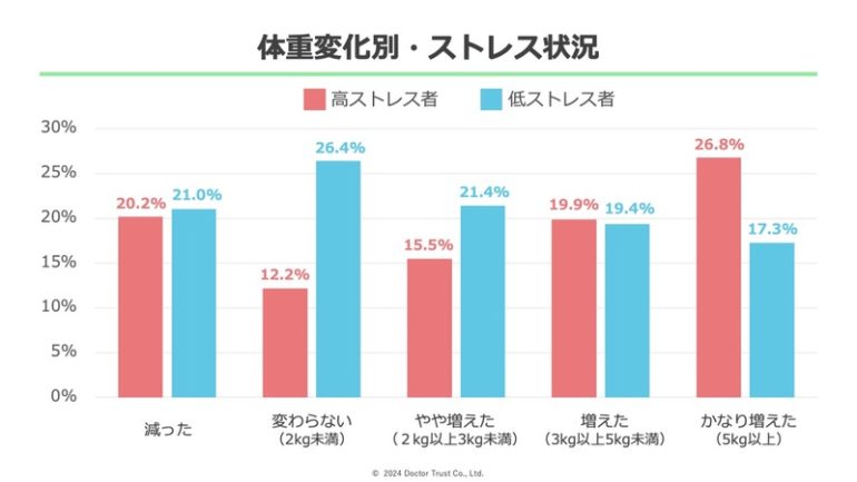 つまり、1年間で体重が「5kg以上増えた」グループの4人に1人以上が高ストレス者であることがわかった。