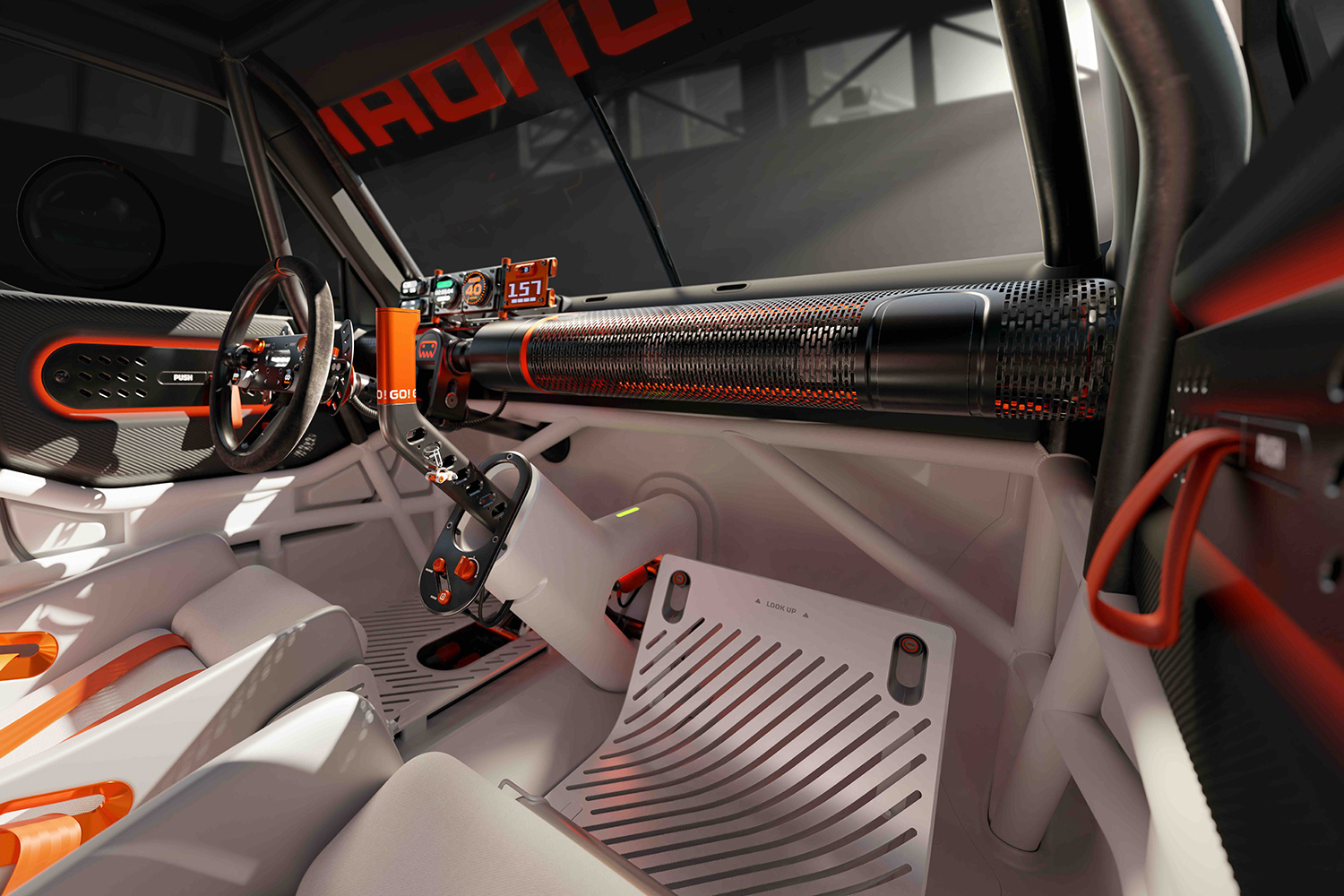 コックピットは、バケットシート、ロールケージ、専用のインストルメントクラスターという必要最小限のものだけを備えたレイアウトで、没入感あるドライブ体験を生み出す。すべての要素が完全に調整可能となっており、「作って、遊んで、壊して、を繰り返す」というモットーに忠実に、「ガレージで組み立てられたマシン」というユーザー中心の精神を反映している。そして感情を刺激される体験とユニークなサウンドシグネチャーにより、乗る人の心にずっと残り続ける。