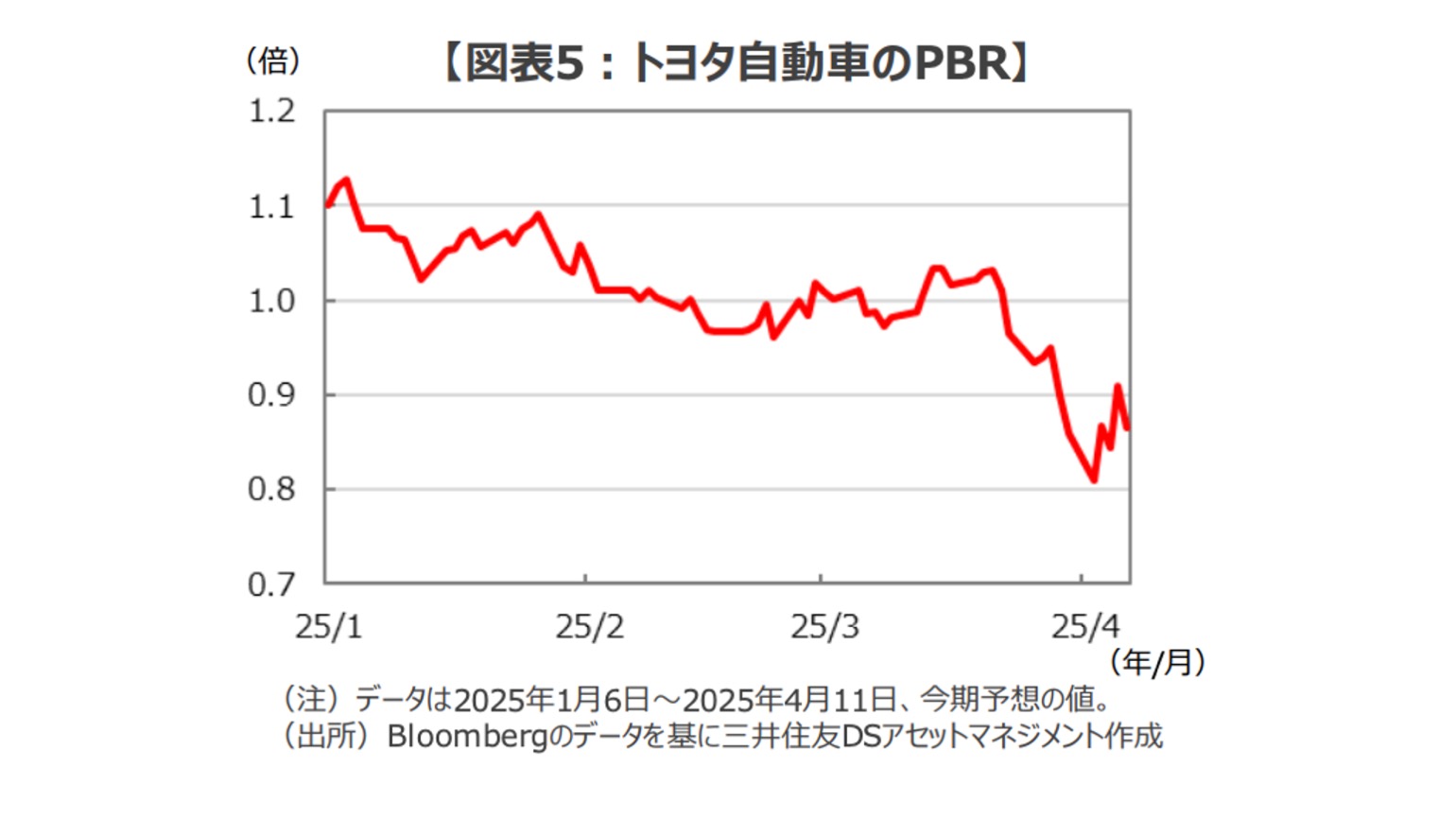 そして、自動車関税の行方に気をもむ株式市場の不安を映して、日本を代表する自動車会社であるトヨタ自動車のPBRは再び1倍を割り込んでいる(図表5)。