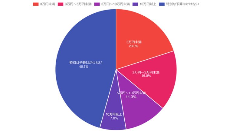 GWにかける予算を聞いたところ、「特別な予算はかけない」が45.7%と最多。主な予定も「自宅でのんびり過ごす」が53.4%、「近場への外出」が37.0%など、全体的に節約傾向が伺える。