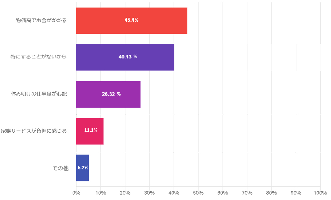 あわせて、“長期休暇があることで仕事へのプラスの影響はあると思いますか”の質問に「あまり思わない」「思わない」「どちらとも言えない」と回答した人が挙げた理由で最多だったのが「物価高でお金がかかる」の45.4%であった。