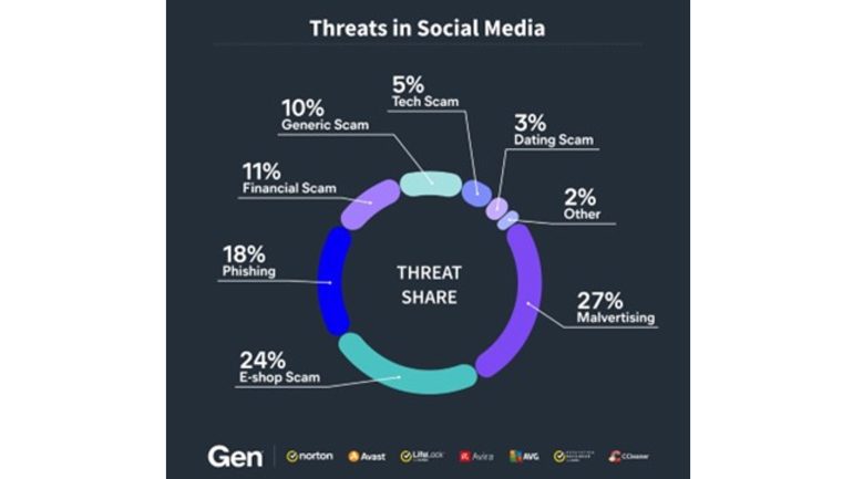 ソーシャルメディア全体で検出された脅威を分析すると、フェイスブックが全体の56.19%を占め、次いでYouTubeが25.92%、X、Reddit、Instagramがそれぞれ6.91%、4.65%、3.79%ということが判明した。