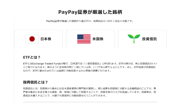 PayPay資産運用で購入できる有価証券は、米国株、日本株、ETF、投資信託などとなり、100円、100ポイントから1円、1ポイント単位での取引が可能です。