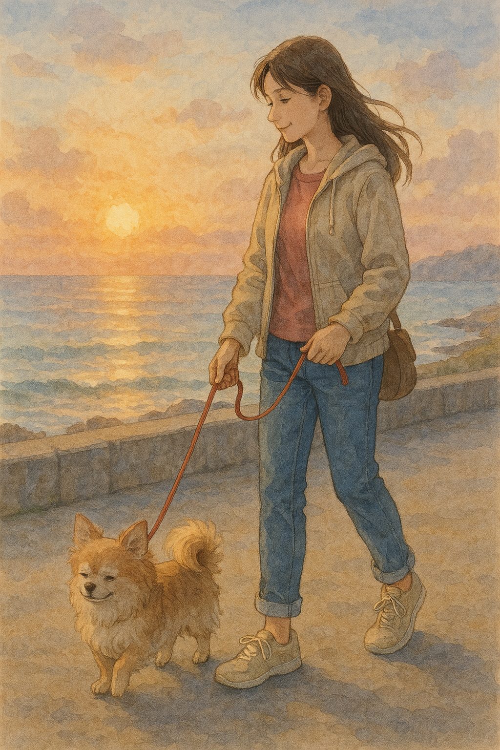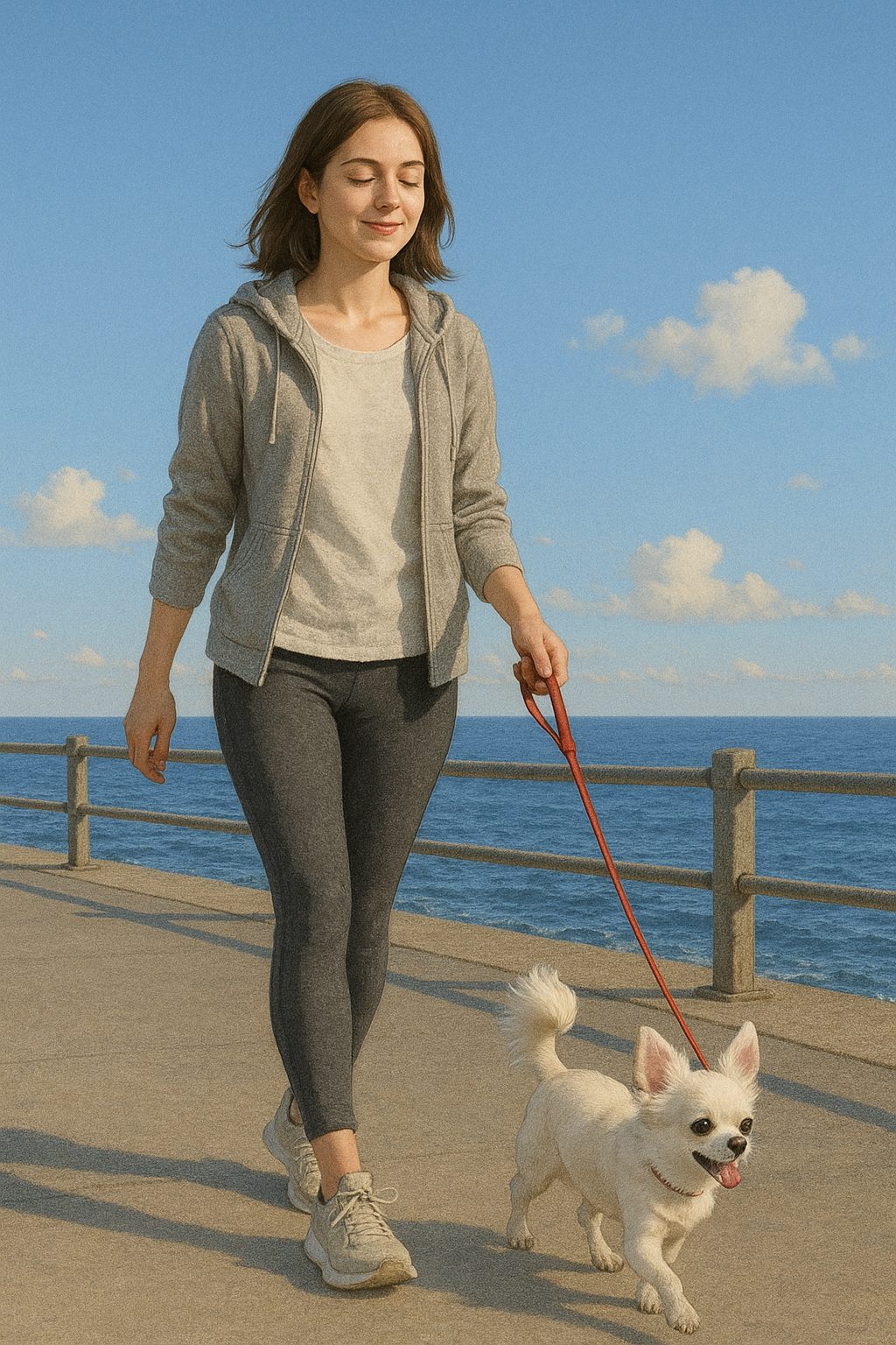 ※「女性が海沿いの道を犬の散歩で歩いている様子」のAI生成画像