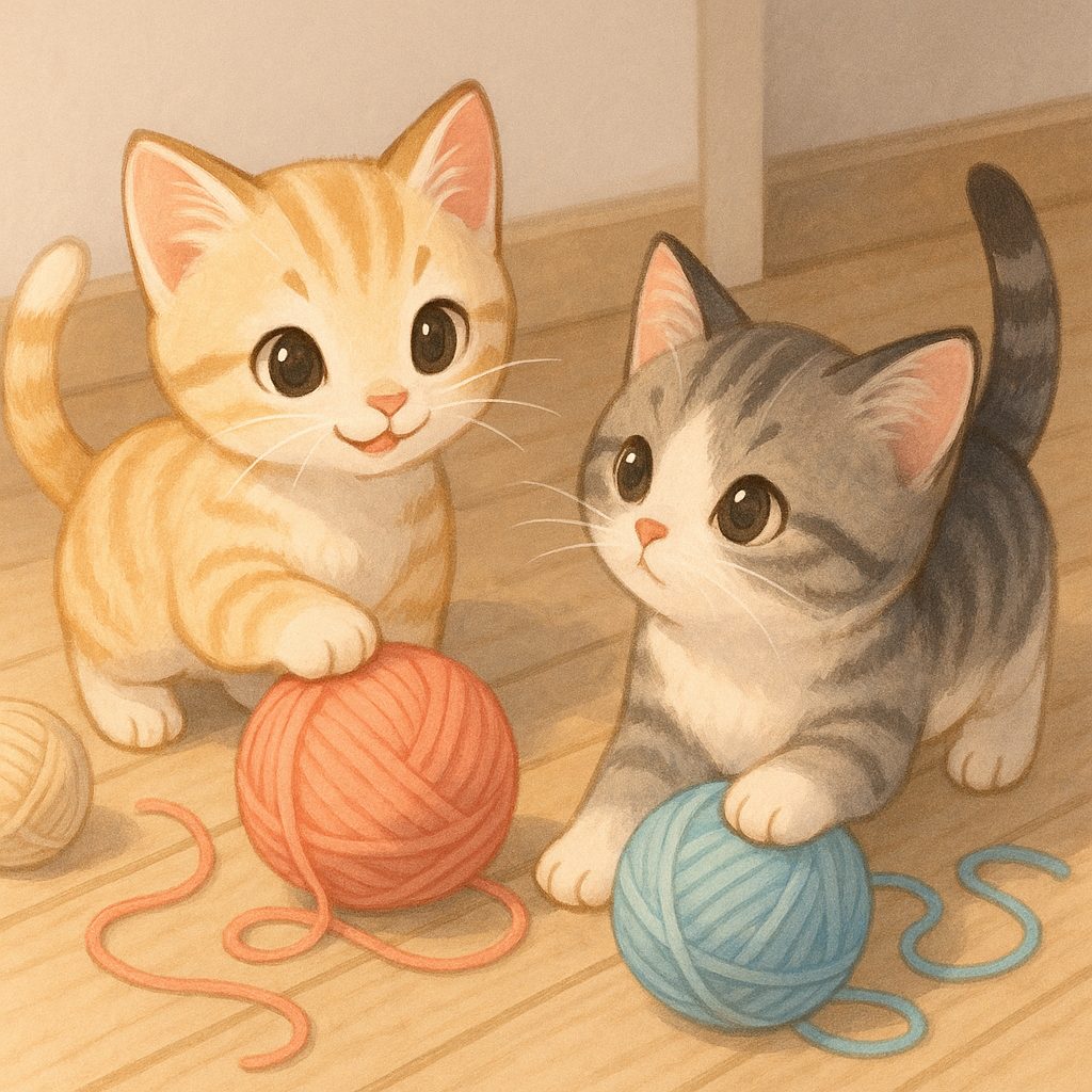 プロンプト:二匹の子猫が毛糸の玉で遊んでいるところをイラストにしてください