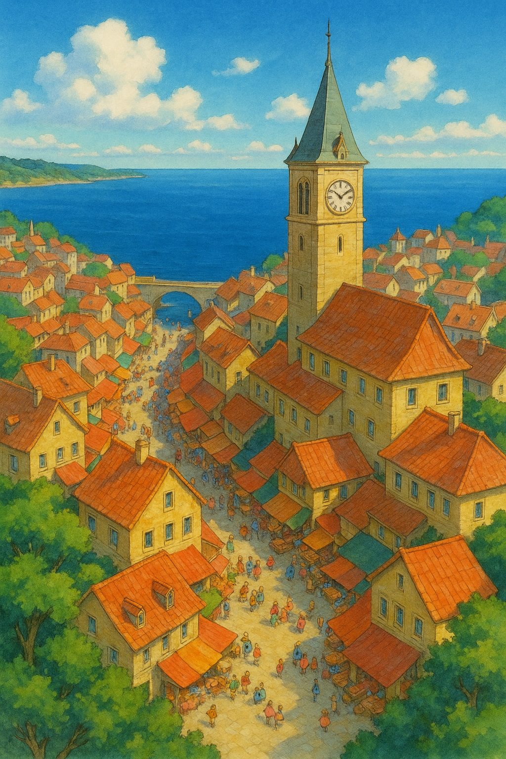 プロンプト:ジブリ風のヨーロッパの街並みで、海が見えて木々も少しあり時計台を建てる。空から一望するアングルで