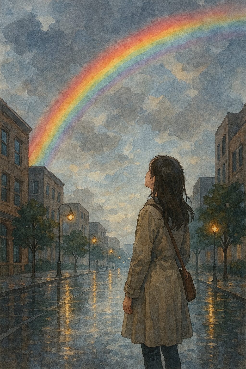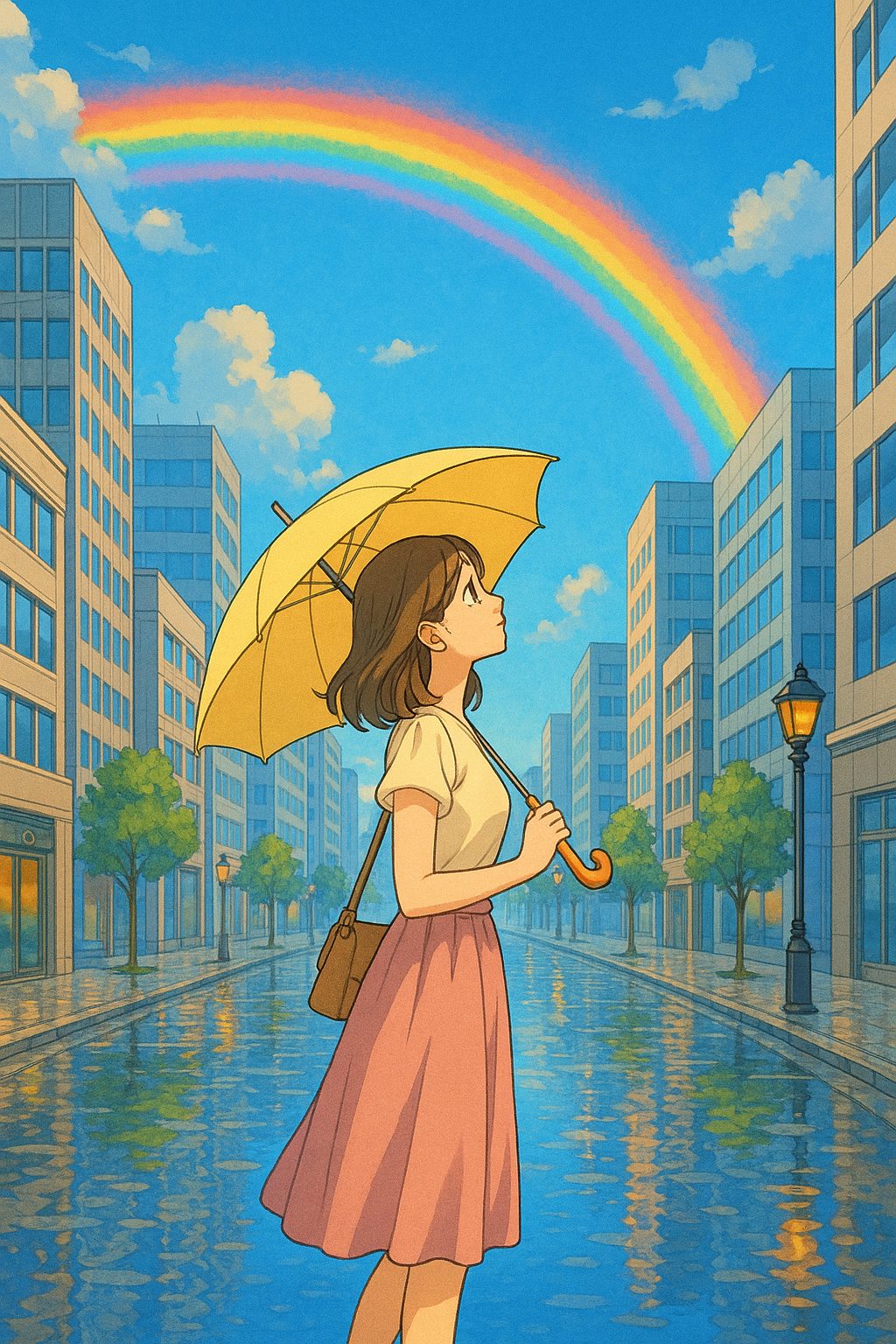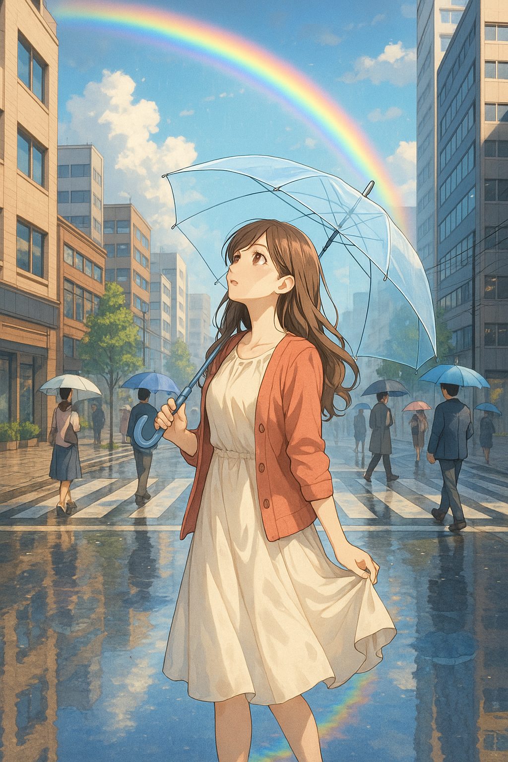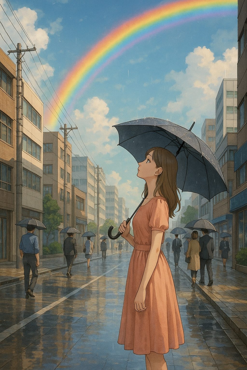 プロンプト:雨上がりの街で空にかかった虹を見上げる女性を描いて