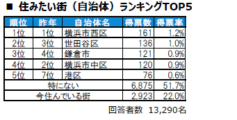 住みたい街(自治体)ランキングにおいて1位は、3年連続で横浜市西区となった。2位は東京都世田谷区、3位は鎌倉市で、いずれも昨年から一つ順位を上げている。5位は東京都港区で、昨年7位から順位を上げてトップ5入りした。