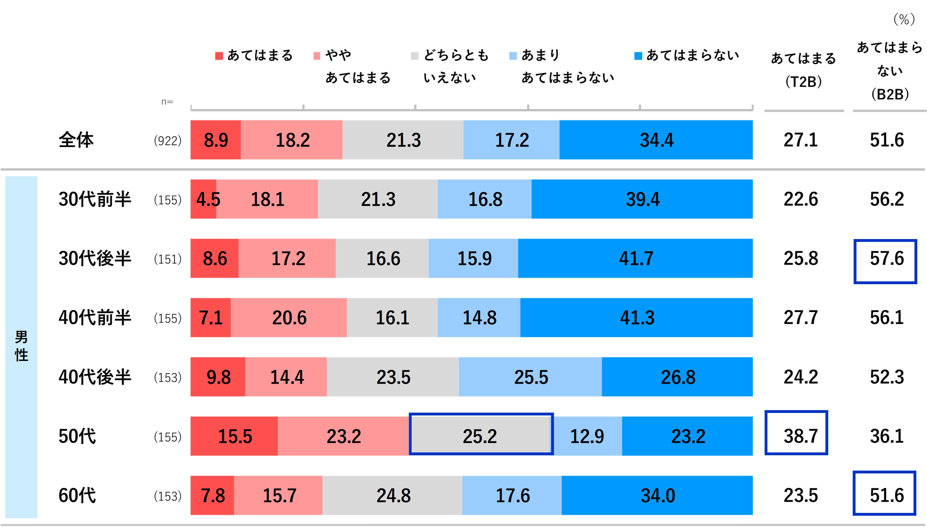 年代別で見ると、「あてはまる(T2B)」が最も多いのは50代で38.7%だったが、各年代とも2~4割と半数は超えていなかった。一方、「あてはまらない(B2B)」が最も多いのは30代後半、本調査上の最年長である60代でも半数以上の51.6%があてはまらないと回答していた。他方「どちらともいえない」は、50代が25.2%と最も多くなっている。