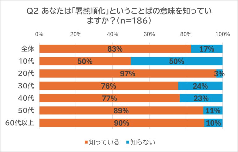 「暑熱順化」のことばを知っている人はその意味まで理解できている傾向だが、“知っている”と“意識している”は別