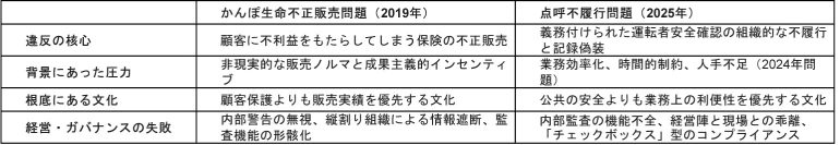 2019年に起きた日本郵政グループ傘下での「かんぽ生命保険」の不正販売問題は、顧客に不利益となる契約を大量に結ばせていた問題であるが、今回の点呼不履行・記録偽装と構造的には問題が酷似している。上表にその問題や背景を整理した。