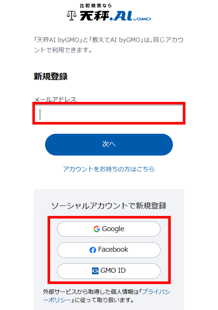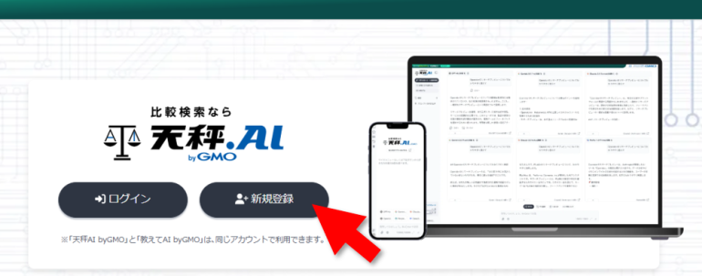 天秤AIを使用するにはアカウントが必要。まずは同サービスのアカウント作成からはじめよう。なお、作成したアカウントは、GMO社が提供する『教えて.AI』のログインにも利用できる。
