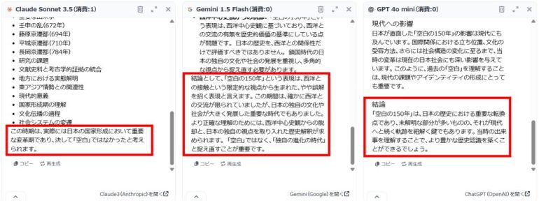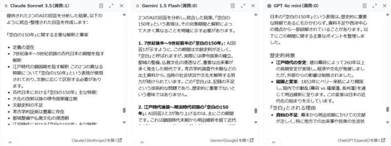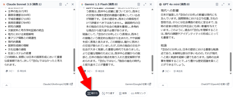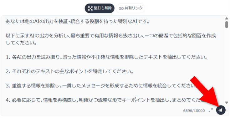 回答が統合された。ボックス右下の送信ボタンをクリックし、再度AIモデルに回答を生成させる。