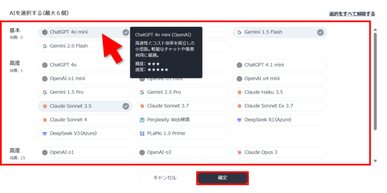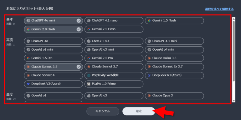 画面左の「お気に入りAIセット」をクリック。最大6つまで好みのAIモデルを選択し「確定」をクリックする。