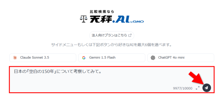 画面中央のボックスにAIに指示したいことや聞きたいことなどを入力し、ボックス右下の送信マークをクリックする。