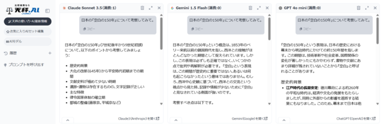 天秤AIは最大6つまでの生成AIをピックアップし、同時に実行できるAIツール。同ツールはChatGPTやGemini、Claudeといった高性能な生成AIにも対応し、自分がピックアップした生成AIの回答の質や回答スピード、表現の個性を比較できる。
