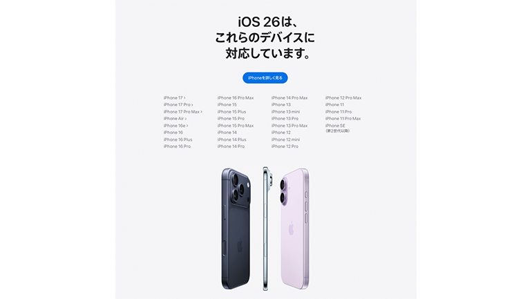 iOS 26は、iPhone 11以降のモデル、iPhone SE(第2世代/第3世代)を対応機種として、無料のソフトウェアアップデートが提供されています。