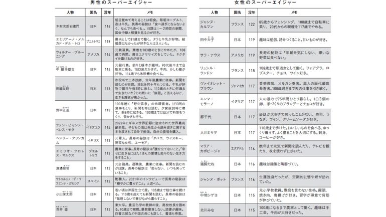 世界中の100歳以上のスーパーエイジャーを表にまとめました。ここから何か共通点のようなものが見えてきませんか。