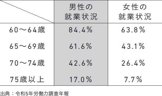 下の表は「60歳以上で働いている人の男女別・年齢別の割合」です。
