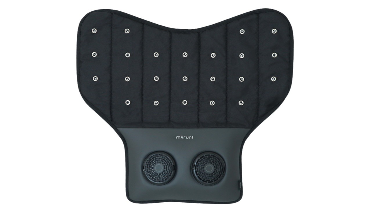 「マルニ デュオクール」は、手持ちのUSB対応のモバイルバッテリーを繋いで、2つ折りの状態でペットカートのフロントガードに掛けて使用する、送風機付きシート。シート前面の2つの強力なモーターファンが空気を取り込み、均等に広がるように設計された23個の穴から、ペットカートキャリー内部へ快適な風を送り込む。