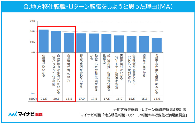 地方移住転職・Uターン転職経験者と検討者に、「地方移住転職・Uターン転職をしよう(したい)と思った理由」を聞くと、「住環境がいいから(21.5%)」が最多で、次いで「自分にあった生活がしたいから(20.3%)」、「自然環境が豊かだから(18.5%)」であった。