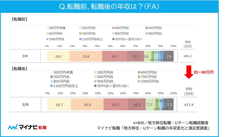 地方移住転職・Uターン転職者の平均年収は413.4万円で、転職前の年収(496.3万円)と比べて平均で約80万円ダウンしている。一方で約4割は年収が上がった人もみられた。