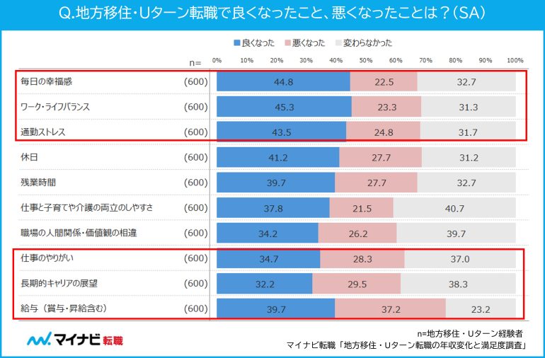 地方移住転職・Uターンによる生活の変化で良くなったものは「ワーク・ライフバランス」「毎日の幸福感」「通勤ストレス」
