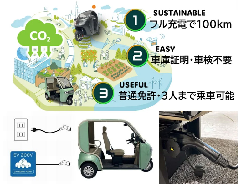 さらにコンパクトでも航続距離はしっかり確保。フル充電で最長約100kmの走行が可能で、近隣の移動はもちろん、複数回の利用にも安心して対応できる。普通自動車免許で運転でき3人乗りまで乗車可能。車検・車庫証明も不要。ヘルメット着用義務もなく、誰でも手軽に乗れるのが特徴となっている。