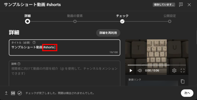 タイトルなどの入力画面へ移動する。タイトルや概要欄の設定が完了したら画面右下の「次へ」をクリック。
