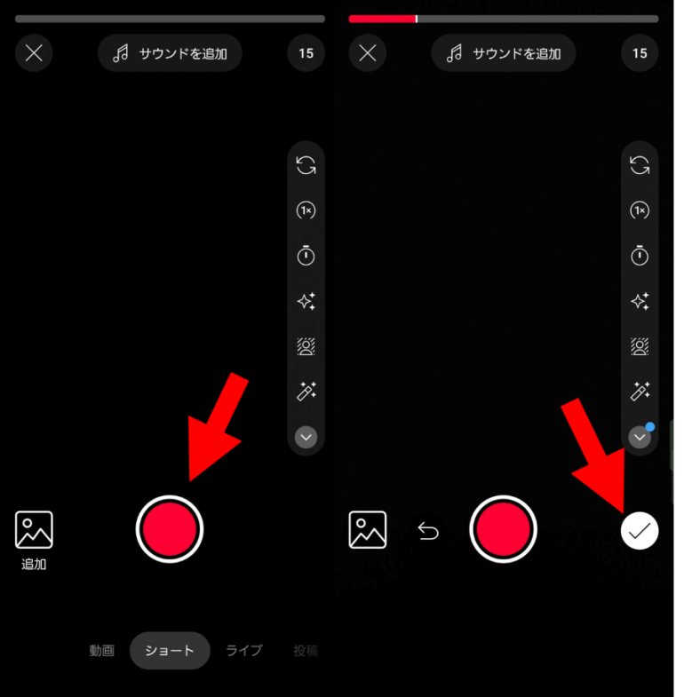 赤い丸をタップして撮影スタート。再度同じボタンをタップして撮影を停止したあと、右側にあるチェックマークをタップ。なお、この画面で使える編集機能は後述する。