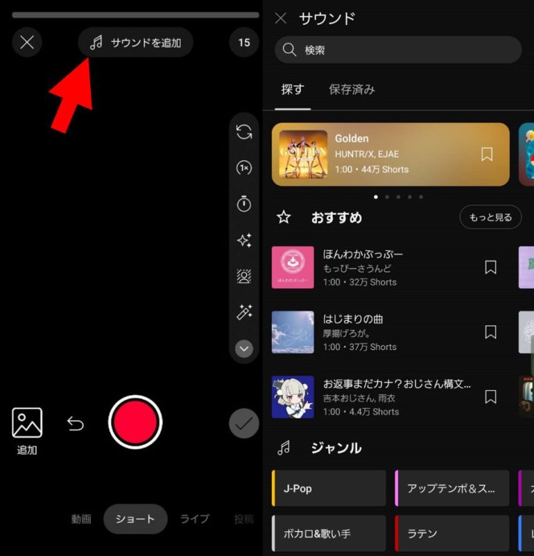 BGMはYouTubeアプリのショート動画撮影画面、上部にある「サウンドを追加」をタップすれば、好きな音楽を選択できる。自身でBGMを用意する必要がなく、初心者でも簡単ににぎやかな動画制作が可能だ。