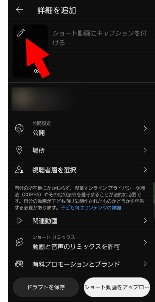 動画をアップロードする前なら、概要を入力するページの左上にあるペンのマークをタップすると、サムネイルを変更したり、編集したりできる。