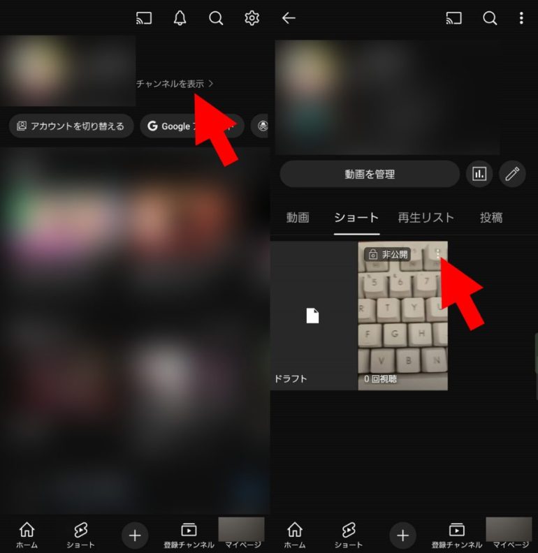 すでにアップロード済みのショート動画のサムネイルを変更する手順は次の通り。YouTubeアプリのマイページから「チャンネルを表示」をタップし、自身のショート動画一覧を開く。対象の動画の右上にある「⁝」をタップしよう。