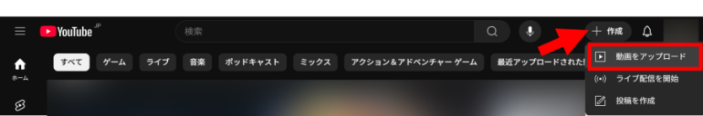 YouTubeにアクセスしログイン後、画面右上の「+作成」をクリックして「動画をアップロード」を選択。