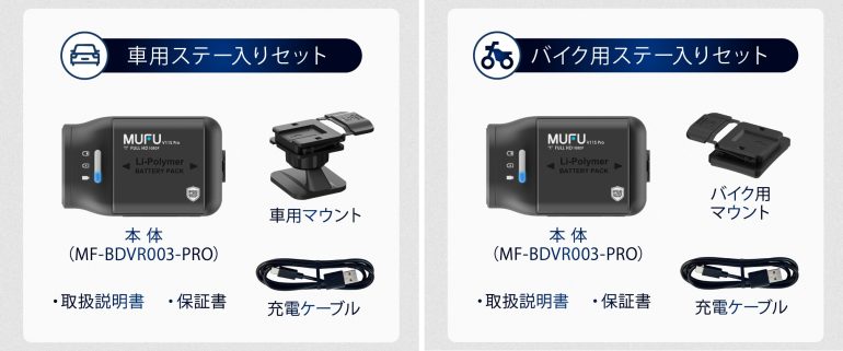 プロジェクト期間は2025年9月29日までで、製品は10月末までに配送予定。リターンは、車用マウントを同梱した「車用ステー入りセット」とバイク用マウントを同梱した「バイク用ステー入りセット」の2パターンを用意し、8月22日現在、「車用ステー入りセット」は14,520円~、「バイク用ステー入りセット」は13,860円~応援購入受付中。そのほか、別売りオプションとして、自転車用マウント(3,950円)やアクションカメラマウント(2,420円)などを用意する。