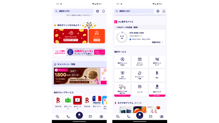 ホーム画面では、楽天グループのサービスに直接アクセスできるほか、楽天ポイントが毎日貯められるSuper Point Screen機能や、ミッションの確認もできます。