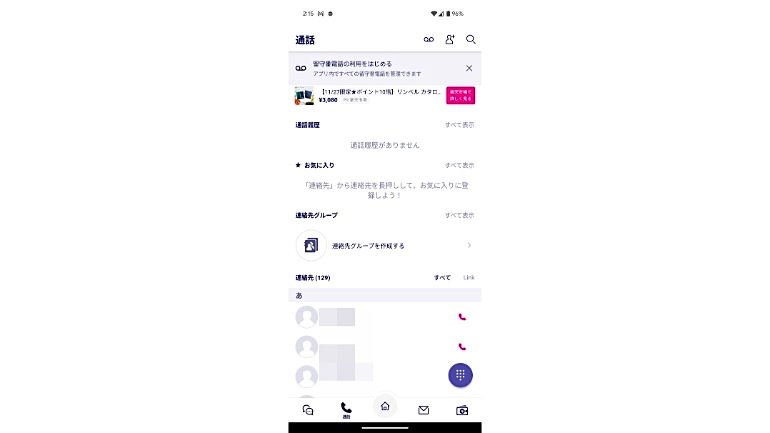 冒頭でも触れた通り、Rakuten Linkアプリは、もともと通話サービスが利用できるアプリです。スーパーアプリになった現在も、下部にある「電話」タブを開くことで、通話画面が開きます。