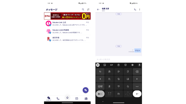 また、左下のメッセージタブからは、SMSの送受信が可能。楽メールタブでは、楽天メールの契約をしている場合、Eメール機能が利用できます。