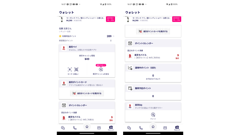 下部タブの一番右にある「ウォレット」をタップすると、楽天ペイ、楽天ポイントカードの機能にアクセスでき、そのままコード支払いや、ポイントカードの表示ができます。