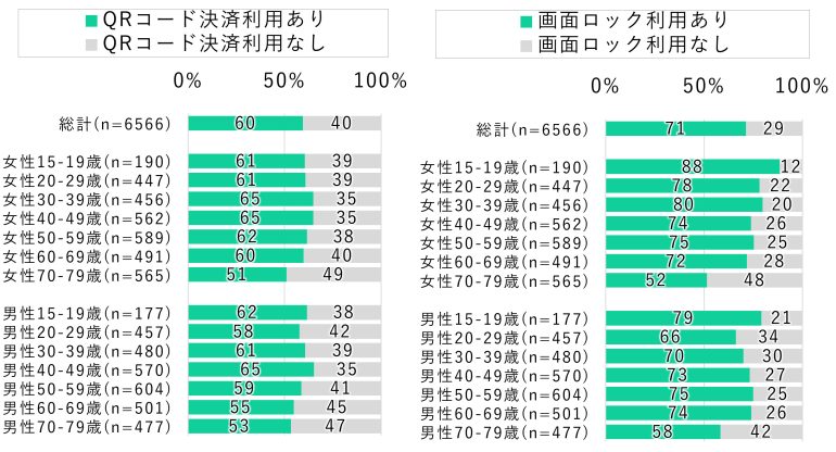 その結果、QRコード決済の利用率はスマートフォン利用者の60%となり、いずれの年代でも利用率は過半数を上回っていた。また、「画面ロック(パスワード、指紋認証等)を利用しているか」と聞いた結果、スマートフォン利用者の71%が画面ロックを利用していると回答をしていた。