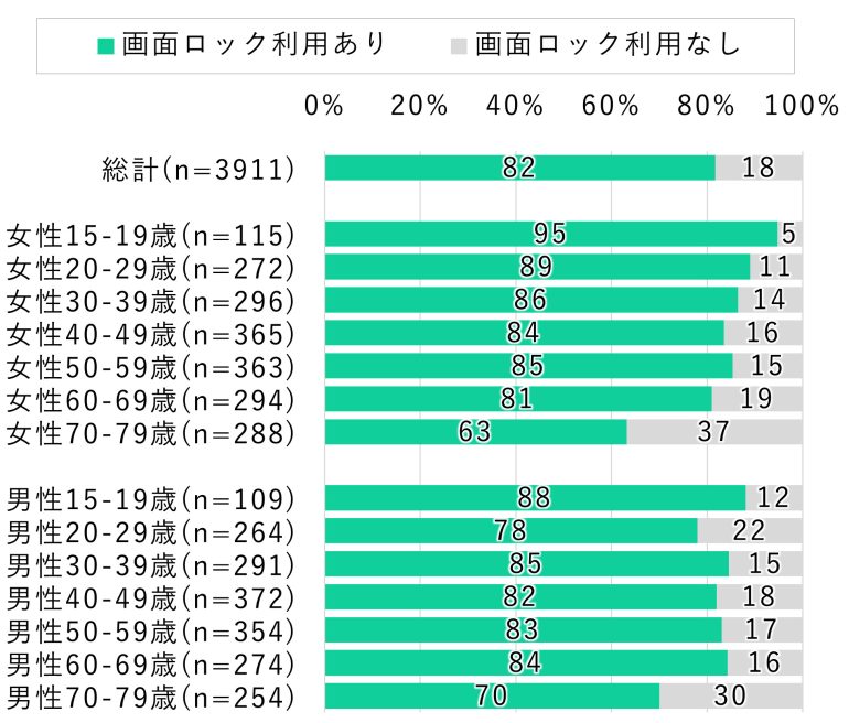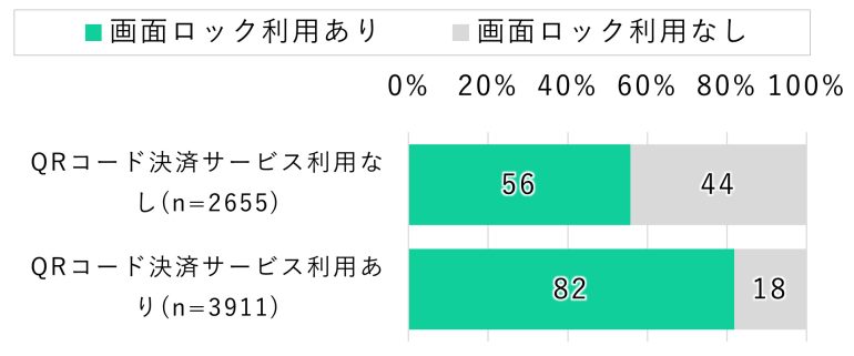 続いて、QRコード決済サービスを利用している人の画面ロック利用状況を確認した。その結果、QRコード決済サービスを利用している人のほうが画面ロックをしている割合が高く、82%が画面ロックを利用していた。