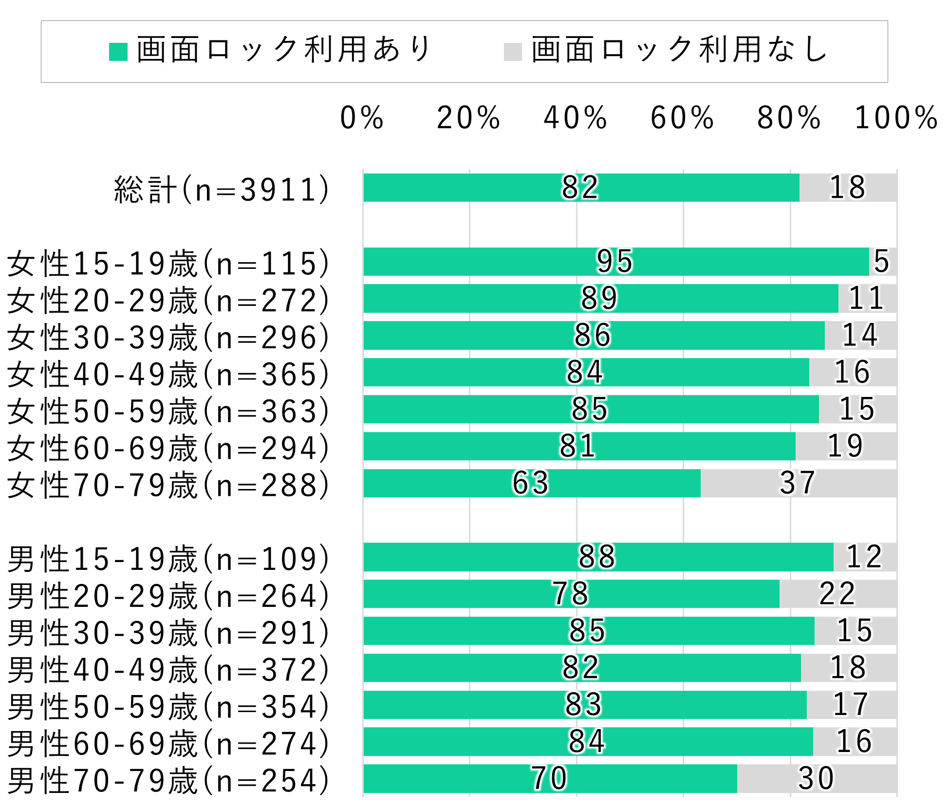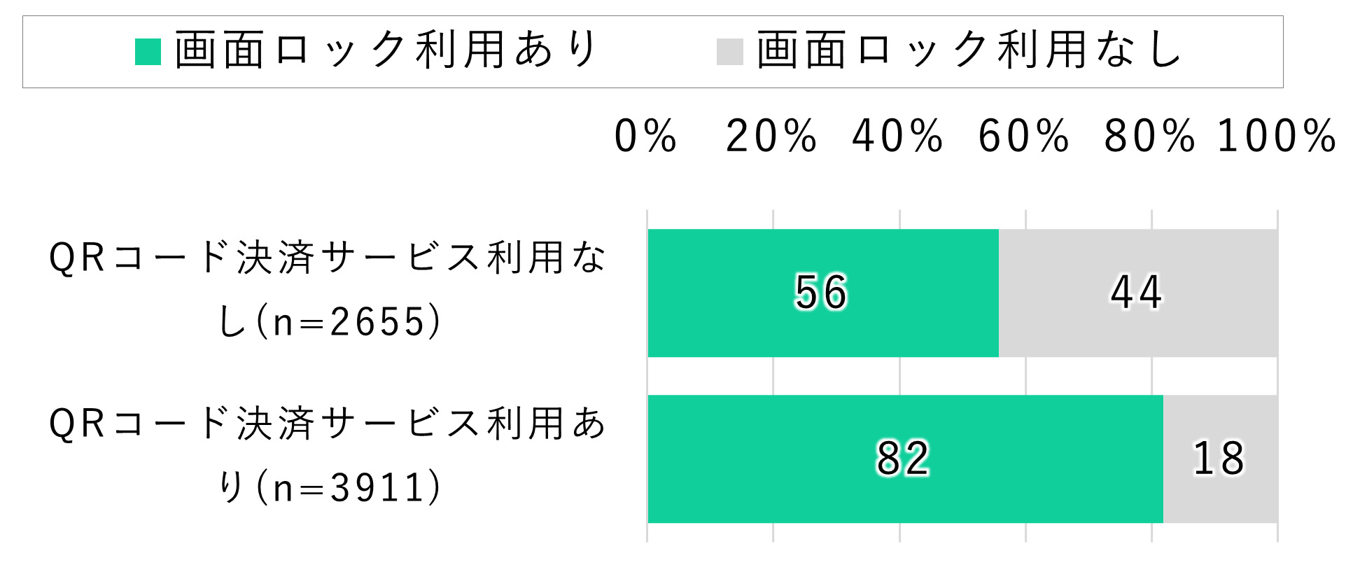 続いて、QRコード決済サービスを利用している人の画面ロック利用状況を確認した。その結果、QRコード決済サービスを利用している人のほうが画面ロックをしている割合が高く、82%が画面ロックを利用していた。