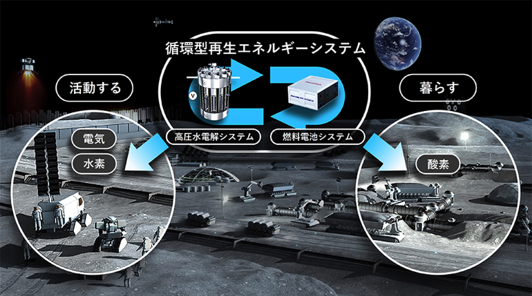 ホンダが持つ燃料電池技術と高圧水電解技術を組み合わせることで、再生可能エネルギー由来の電力を用いてこの月面の水を電気分解し、水素と酸素を生成・貯蔵し、燃料電池で発電するというシステムです