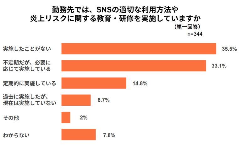 勤務先でSNSの適切な利用方法や炎上リスクに関する教育・研修を実施しているかどうかについては、「実施したことがない」が35.5%でもっとも多い回答になった。