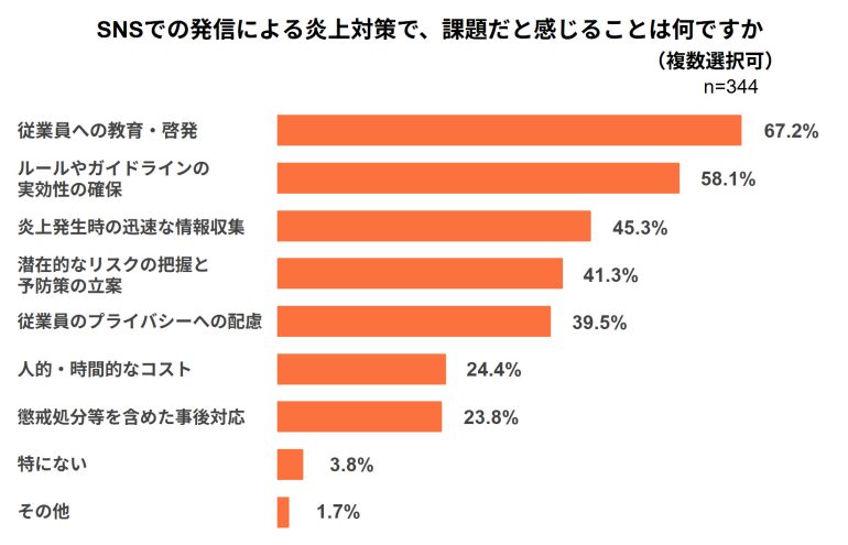 SNSでの発信による炎上対策での課題については、「従業員への教育・啓発」が67.2%を占め上位に。続いて「ルールやガイドラインの実効性の確保」が58.1%、「炎上発生時の迅速な情報収集」が45.3%と続いた。