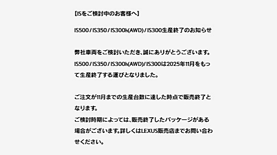 しかし、このIS500も、ISの生産終了に伴い、その歴史に幕を閉じます。