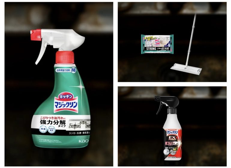 ゲーム内に登場する掃除アイテムは、「マジックリン ハンディスプレー(台所用強力洗剤)」、「クイックルワイパー 立体吸着ウエットシート ストロング 空間の超消臭(フロア用ウエットシート)」など全6種類。